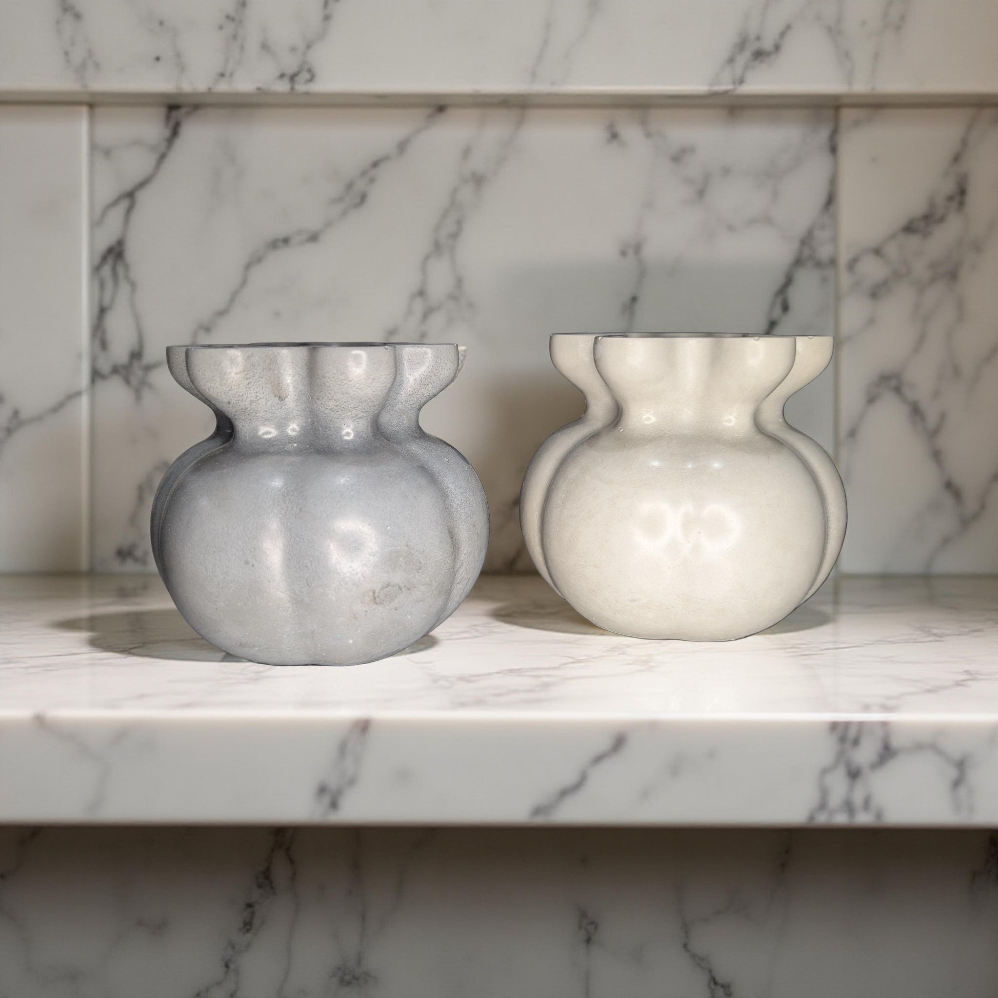 Its unique design mimics a small bag, with a rounded body that gathers at a cinched neck and flares into a beautiful, fluted rim. Hand-poured from smooth concrete, this vase has a substantial feel and a beautiful matte finish. It is the perfect vessel for showcasing a few delicate dried stems, a plume of pampas grass, or to stand alone as a minimalist sculptural object.