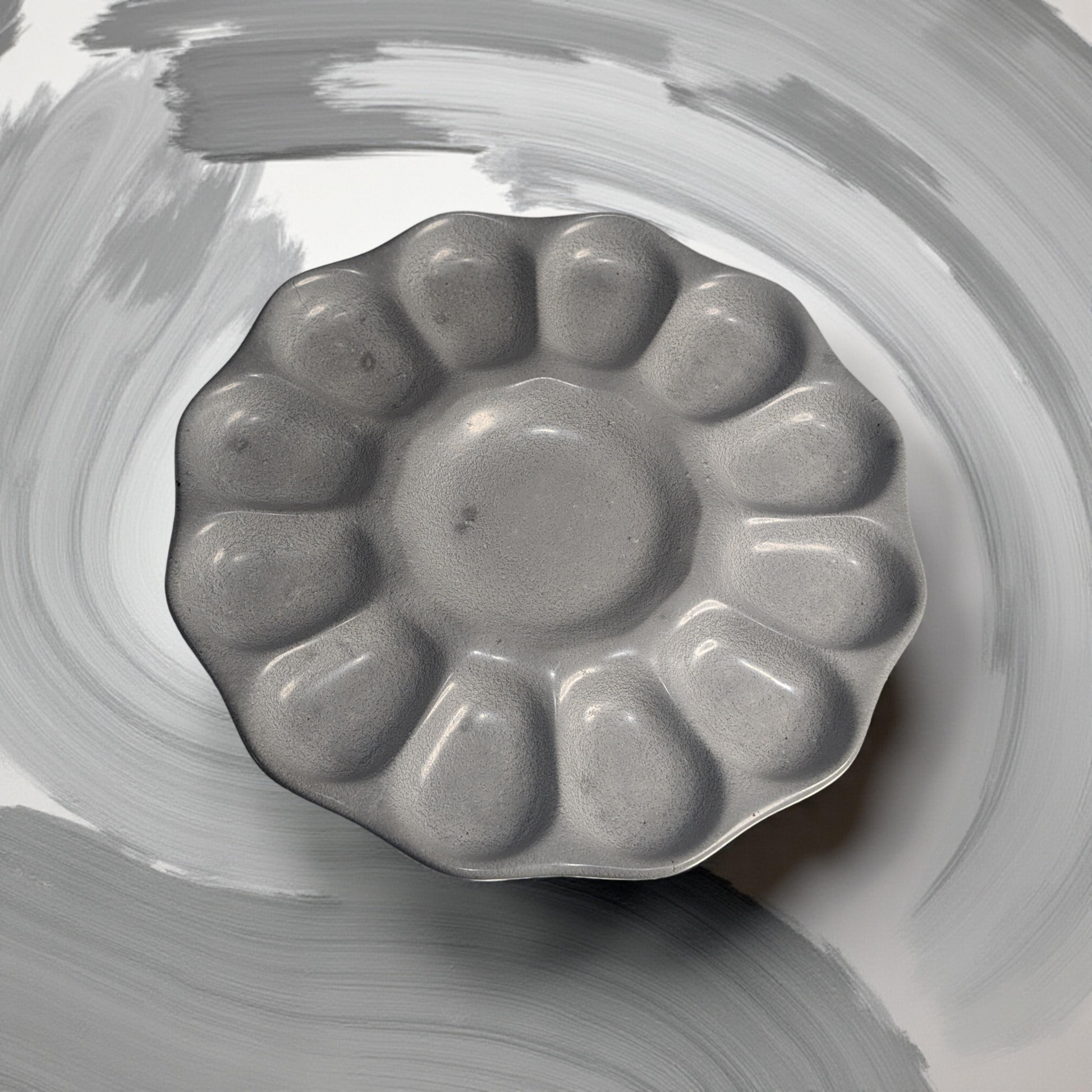 Serve your deviled eggs in style with this handmade concrete egg holder, designed for both beauty and function. Measuring 8.7 inches in diameter, this modern tray features twelve smooth, rounded wells perfectly shaped to hold eggs securely while adding a touch of industrial charm to your table.