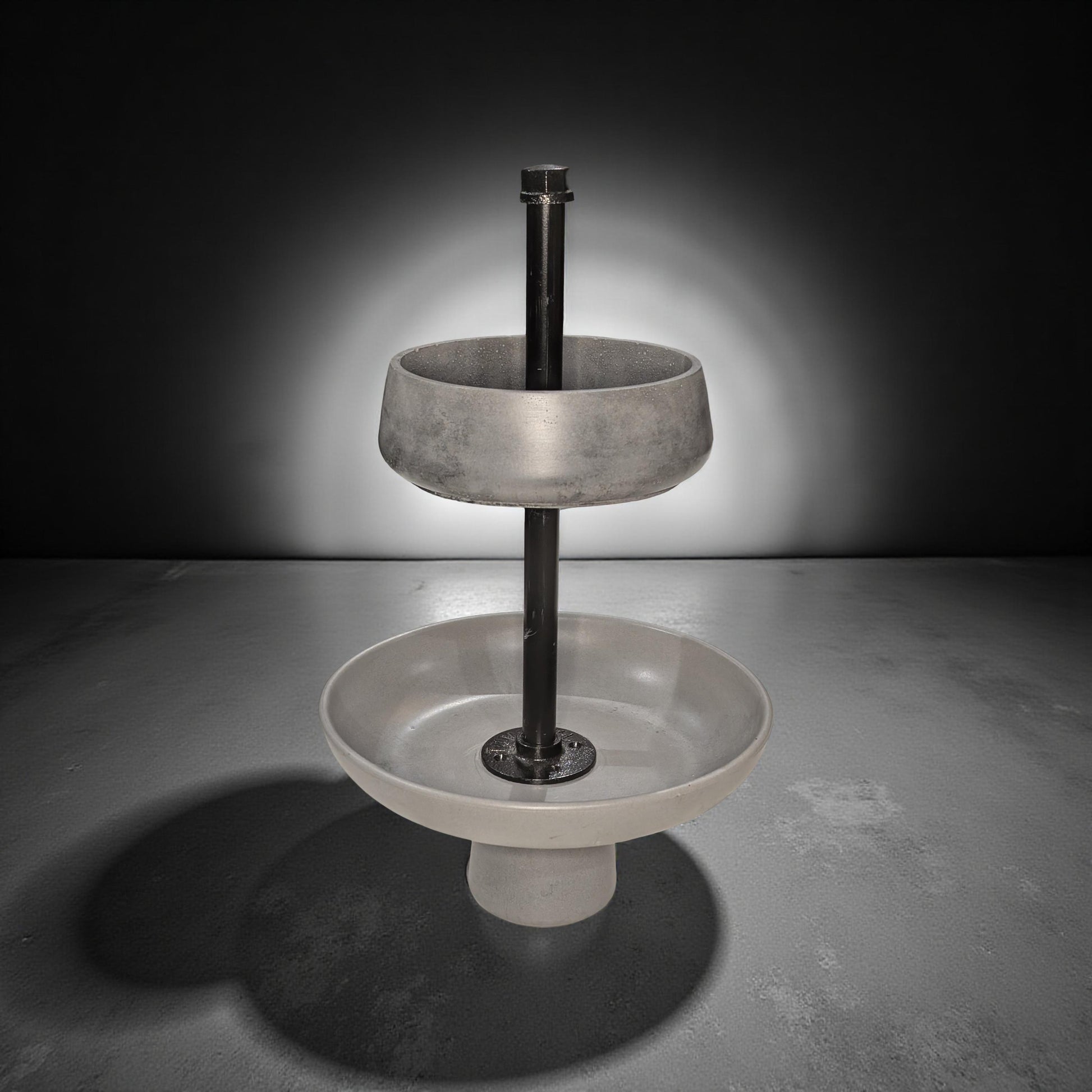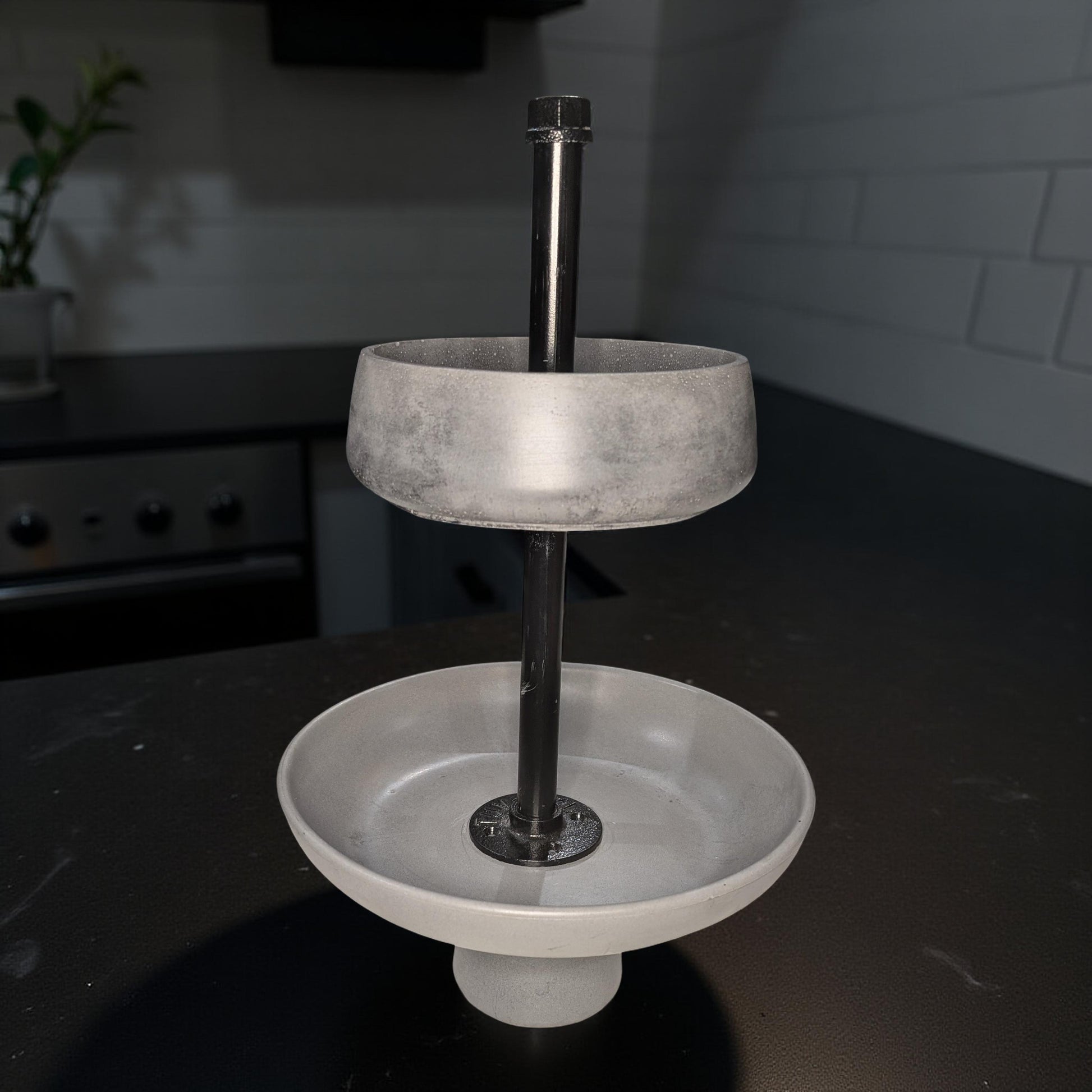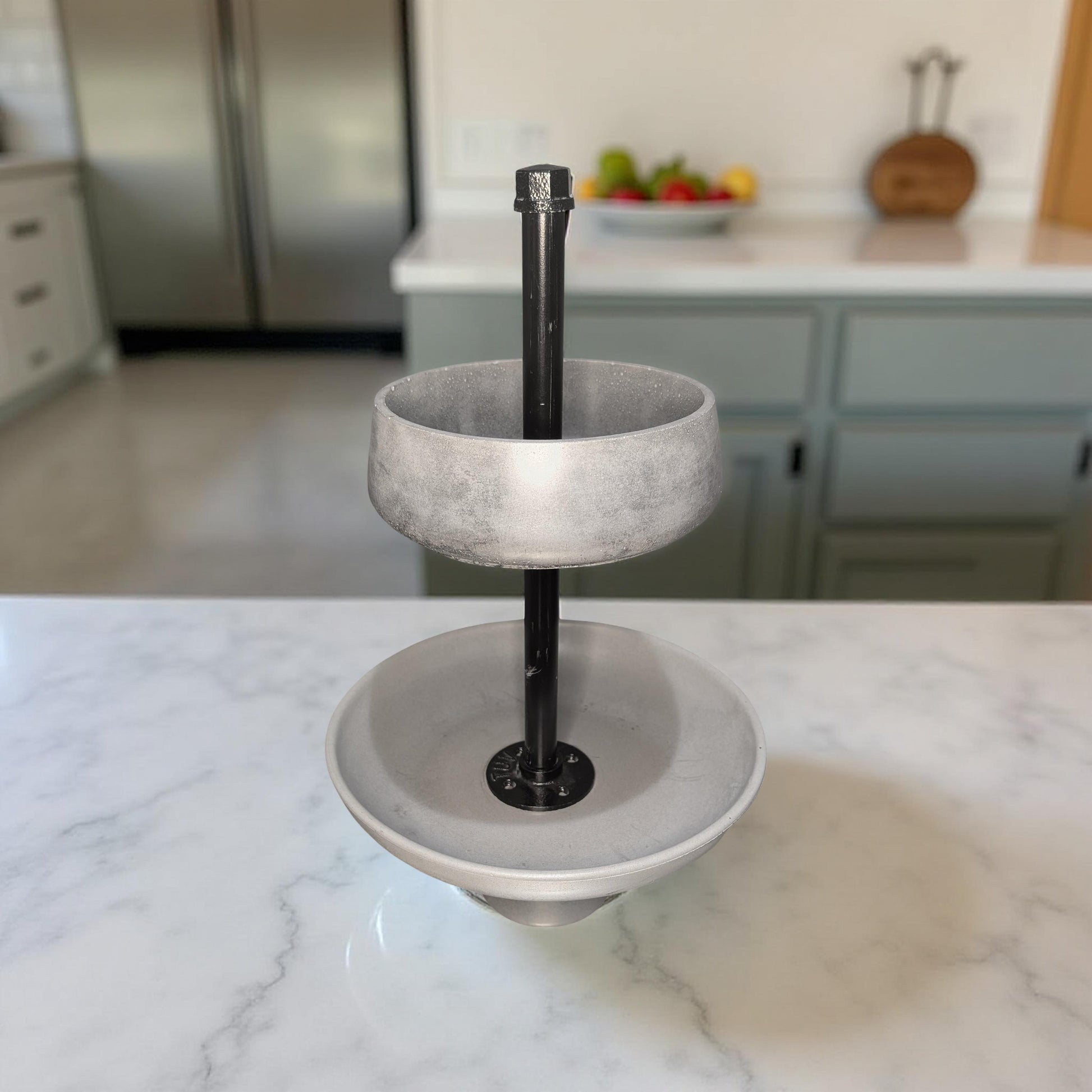 This handmade concrete tiered tray is the perfect blend of modern minimalism and industrial style. Standing 19 inches tall, this two-tier display features a 10-inch bottom bowl and a 7-inch top bowl connected by a sturdy black metal pole. The top bowl is fully adjustable, allowing you to raise or lower it to perfectly fit your décor or items.