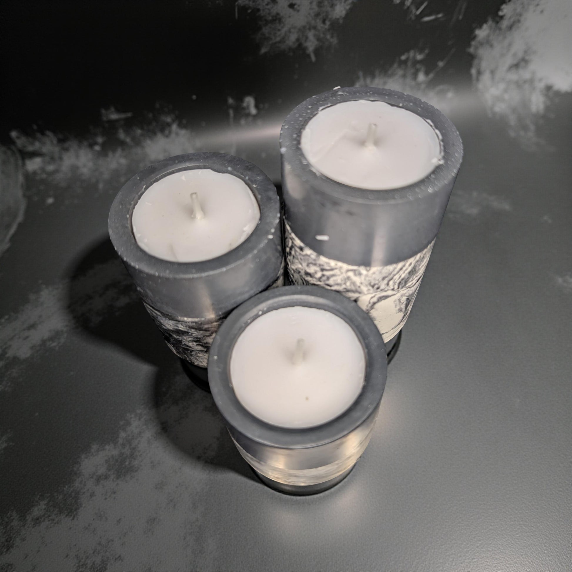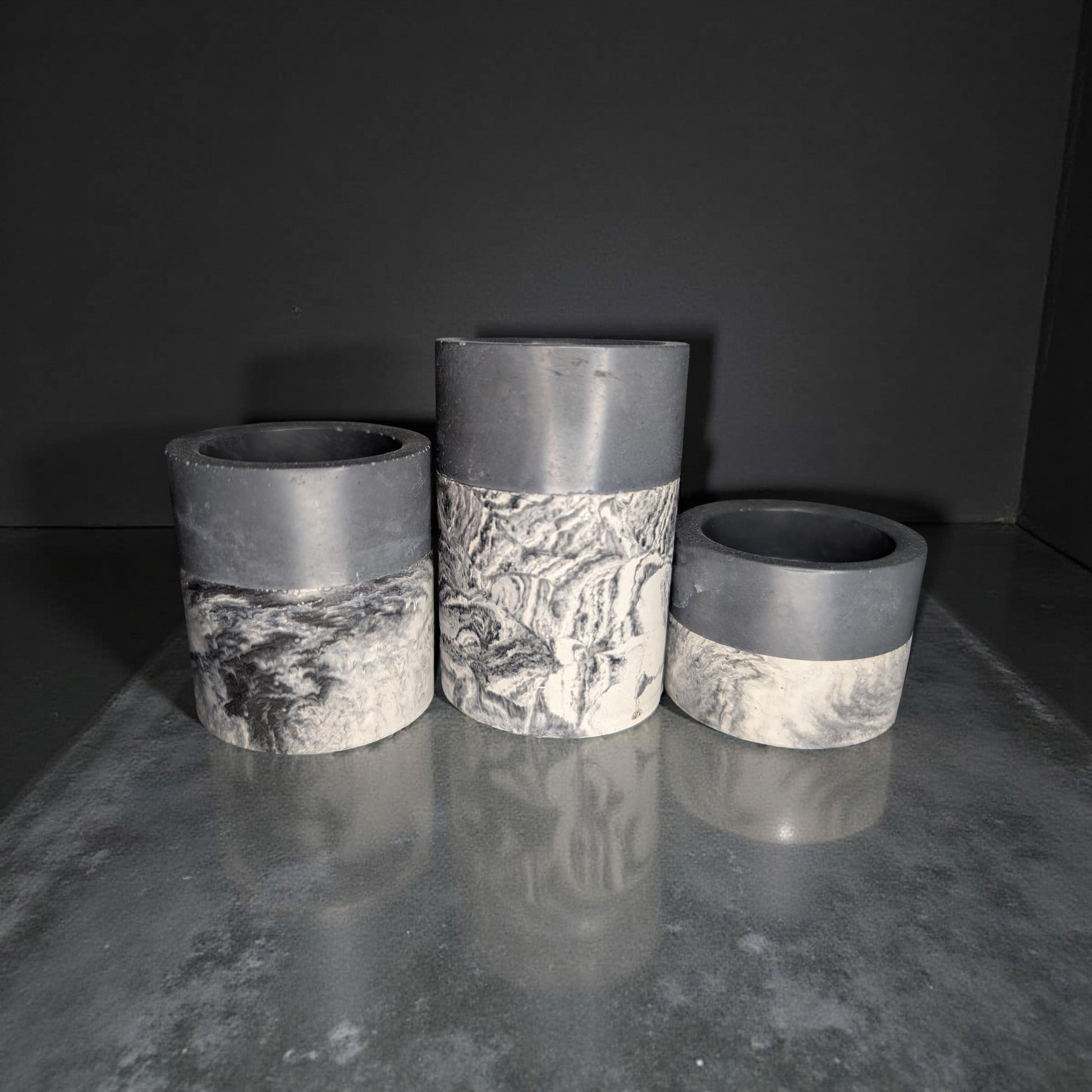 Bring a touch of modern elegance to your home with this set of three handmade concrete tea light candle holders. Each piece features a sleek two-tone design—a smooth gray top paired with a stunning marbled concrete base that gives every holder its own unique character.